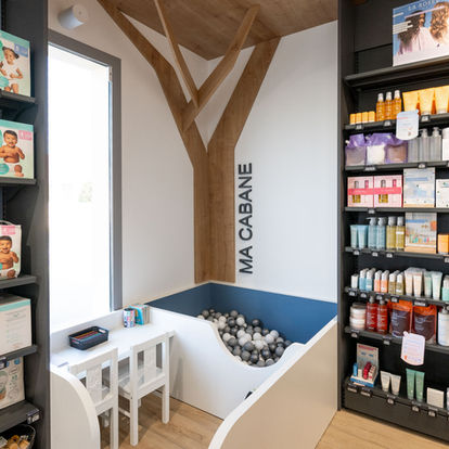 La pharmacie des Bagé propose un univers chaleureux et contemporain, où le blanc et le bois s’harmonisent avec des touches de bleu et de noir pour une identité élégante et moderne.