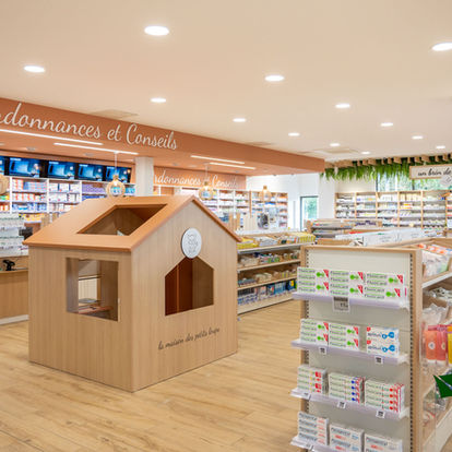 Pour la Pharmacie Puig Léveillé, nous avons conçu un espace moderne et rafraîchissant, mêlant douceur et élégance.